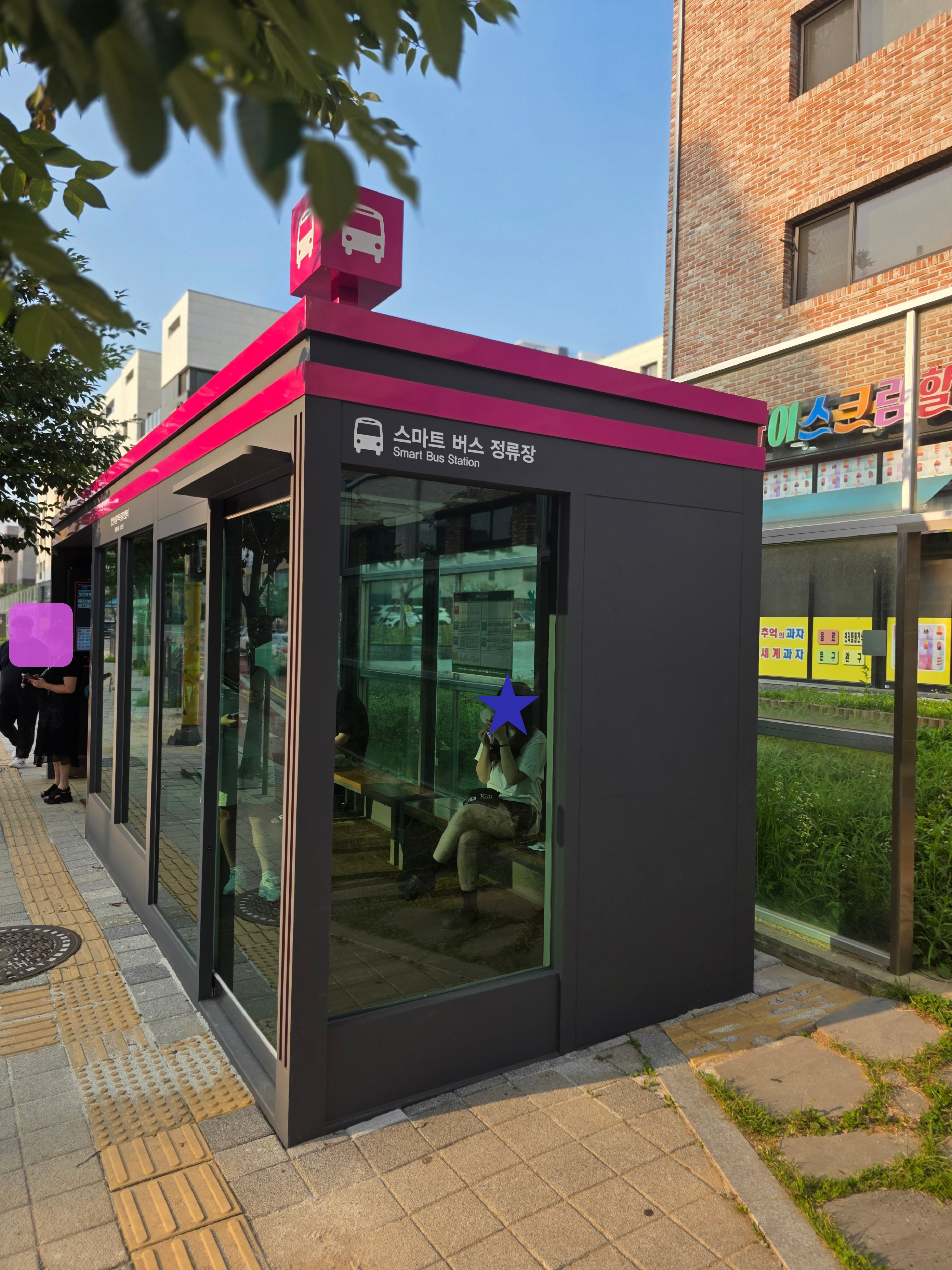 정류장 내부에는 천장형 냉방 에어컨이 탑재되어 있어, 무더운 여름에도 시원하게 버스를 기다릴 수 있습니다.
